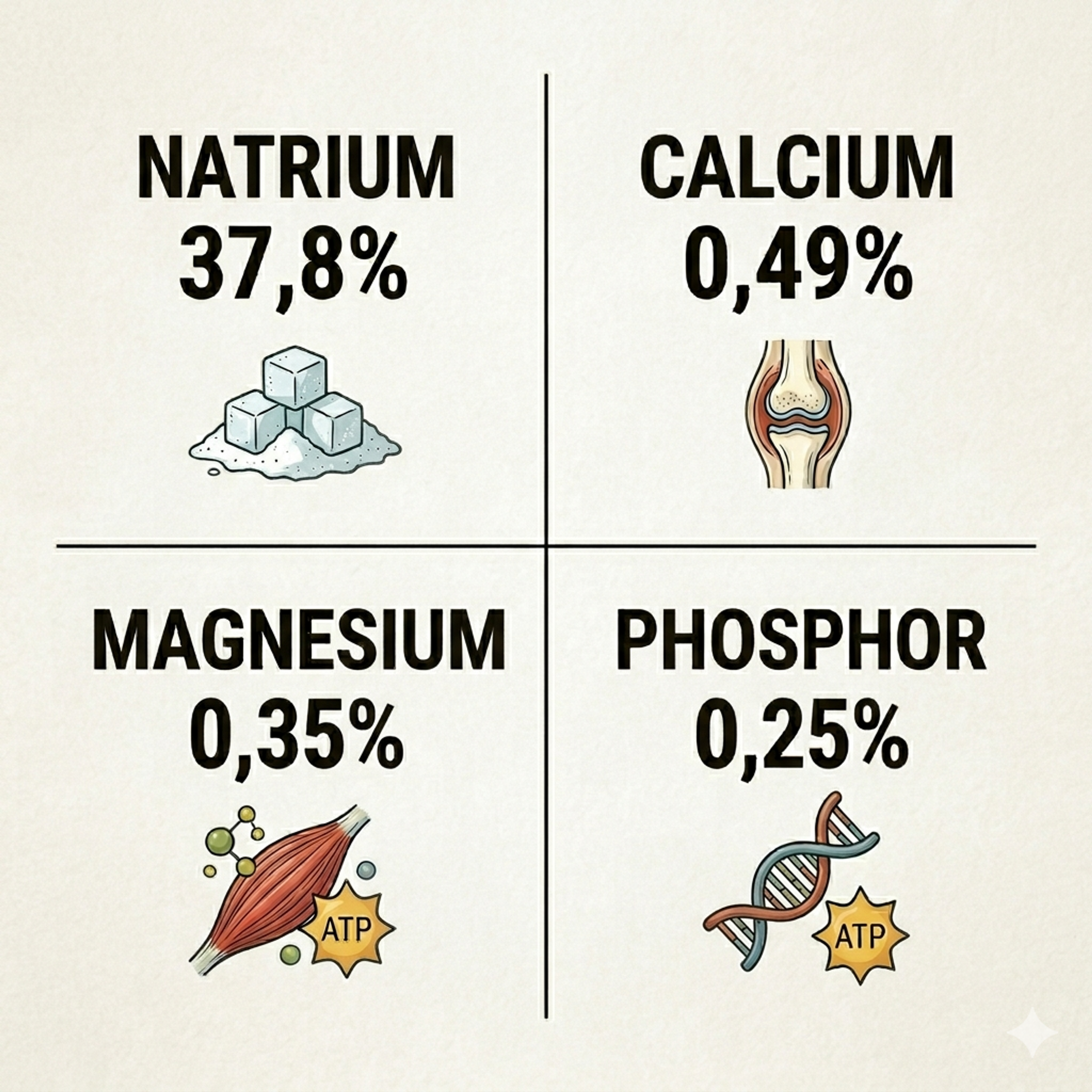 Analytical components: 37.8% Sodium, 0.49% Calcium, 0.35% Magnesium, 0.25% Phosphorus