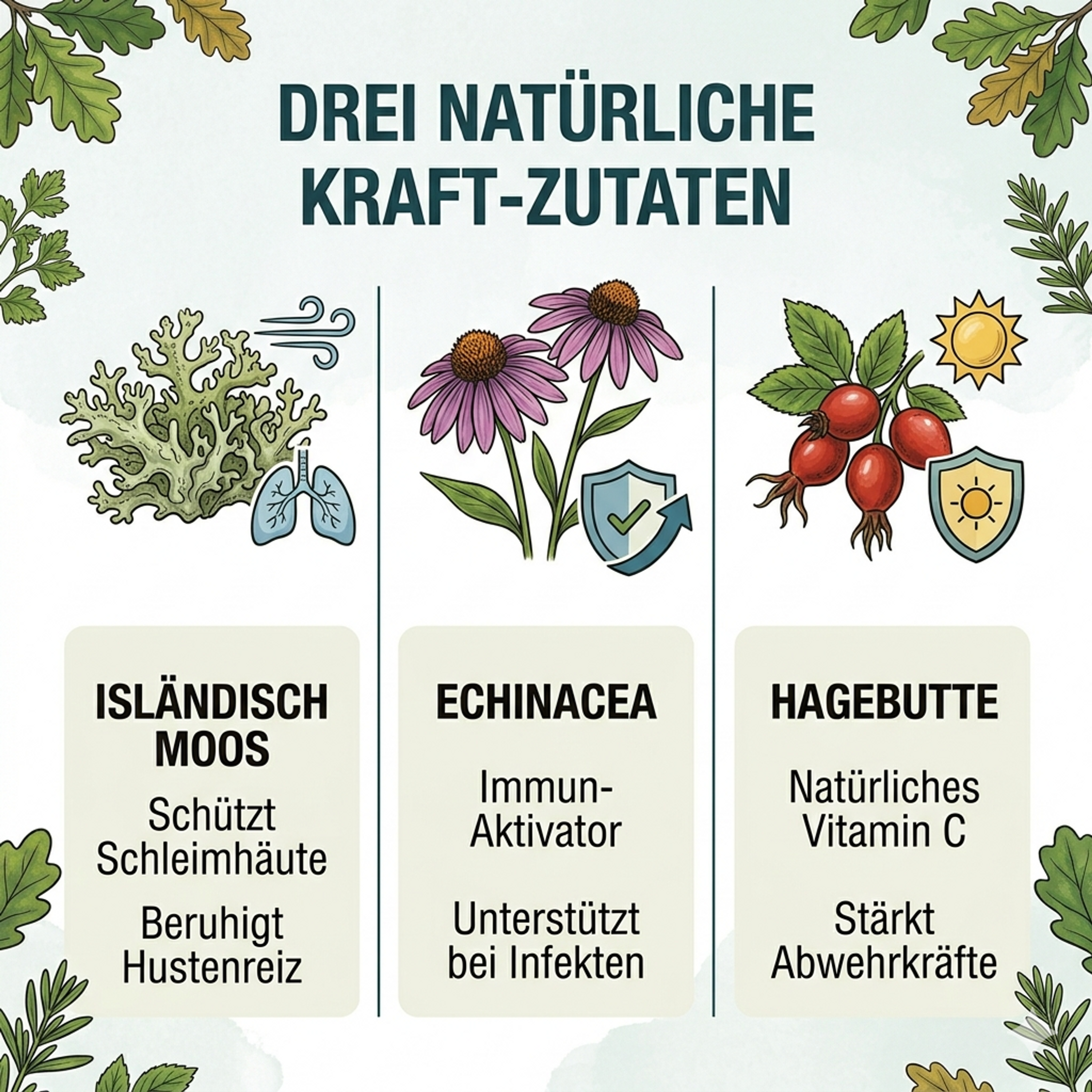 Iceland Moss: Renowned for its protective effect on the respiratory tract. It forms a soothing film over the mucous membranes, calming cough irritation and providing anti-inflammatory support.