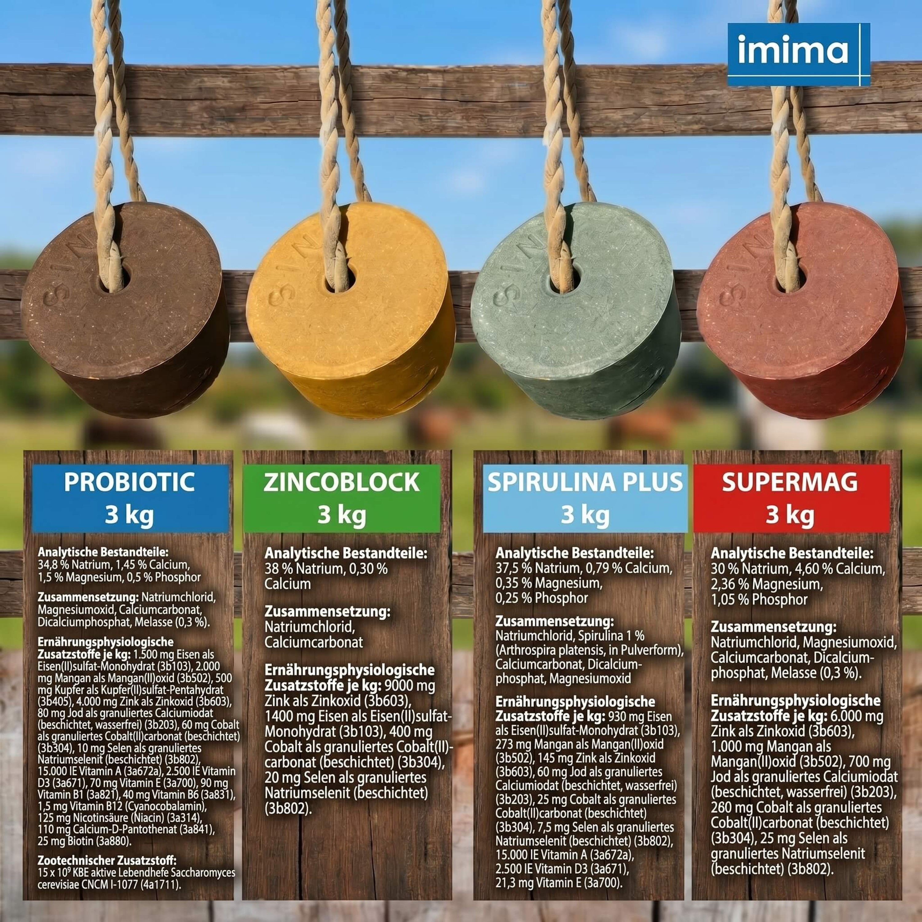 - Ernährungsphysiologische Zusatzstoffe je kg: 1.500mg Eisen als Eisen(II)-sulfat-Monohydrat (3b103), 2.000mg Mangan als Mangan-II-oxid (3b502), 500mg Kupfer als Kupfer-II-Sulfat Pentahydrat (3b405), 4.000mg Zink als Zinkoxid (3b603), 80mg Jod als granuliertes Kalziumjodat (beschichtet, wasserfrei) (3b203), 60mg Kobalt als granuliertes Kobalt-II-carbonat (beschichtet) (3b304), 10mg Selen als granuliertes Natriumselenit (beschichtet) (3b802), 15.000 I.E. Vitamin A (3a672a), 2.500 I.E. Vitamin D3 (3a671), 70mg Vitamin E (3a700), 90mg Vitamin B1 (3a821), 40mg Vitamin B6 (3a831), 1,5mg Vitamin B12 (Cyanocobalamin), 125mg Nicotinsäure (Niacin) (3a314), 110mg Calcium-D-Pantothenat (3a841), 25mg Biotin (3a880)