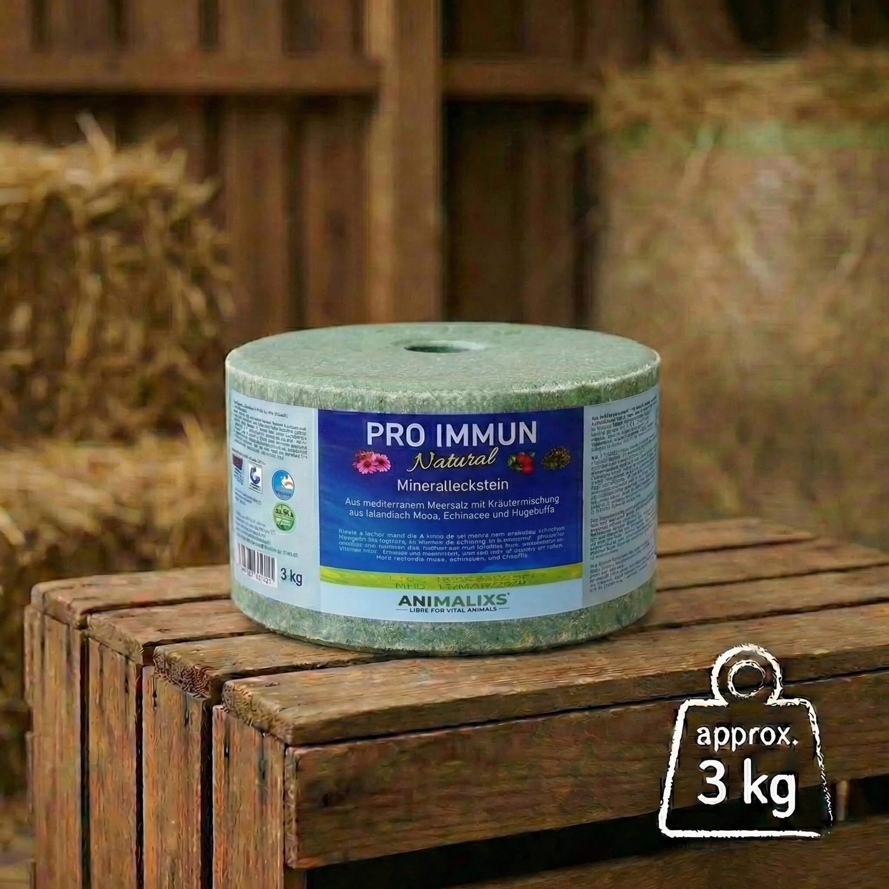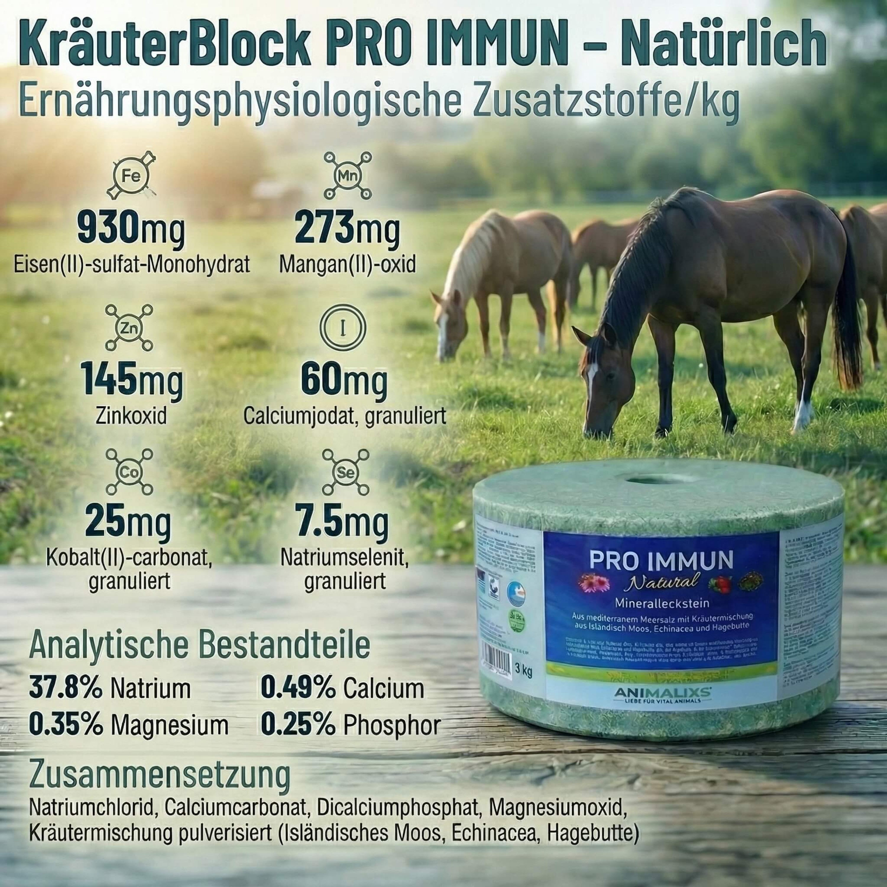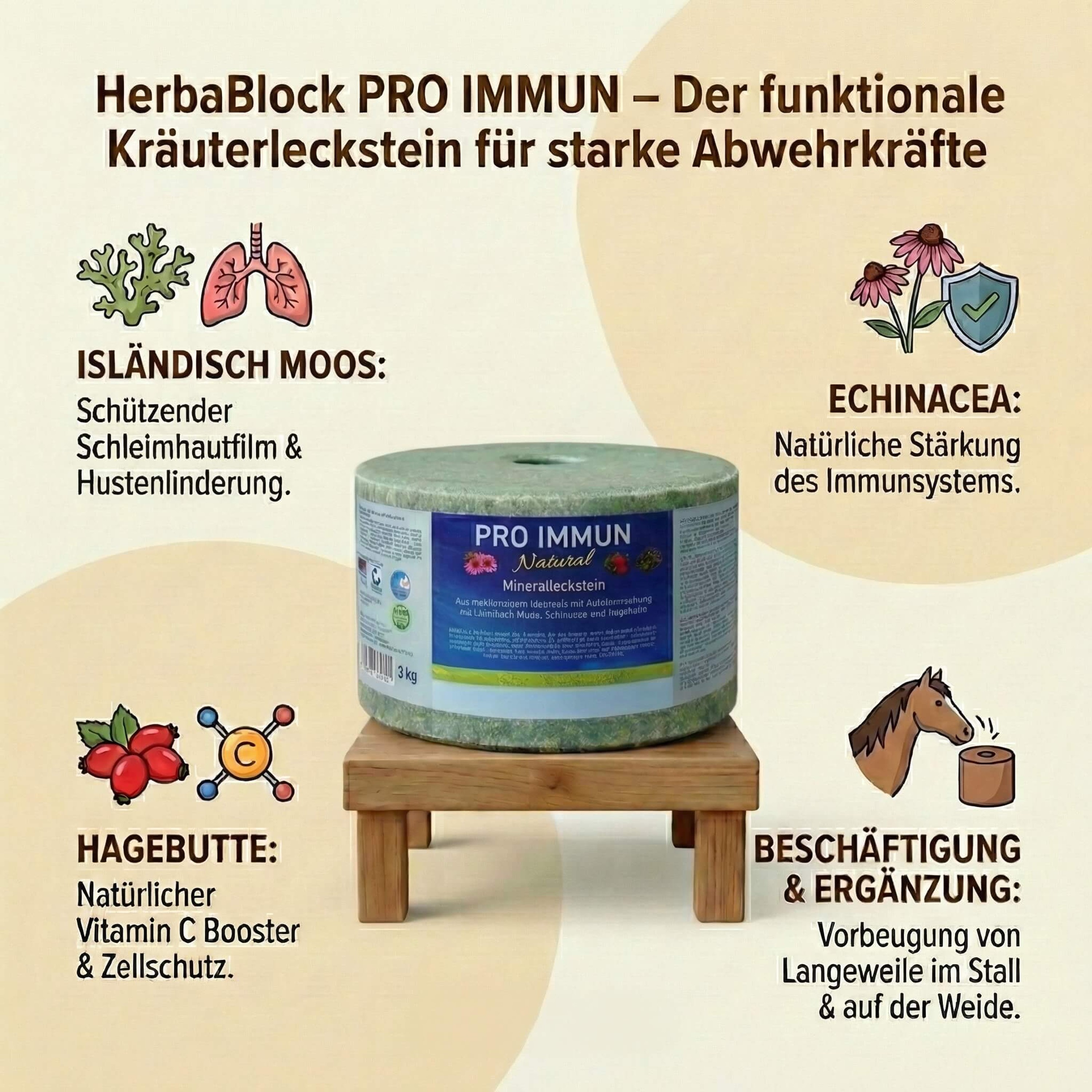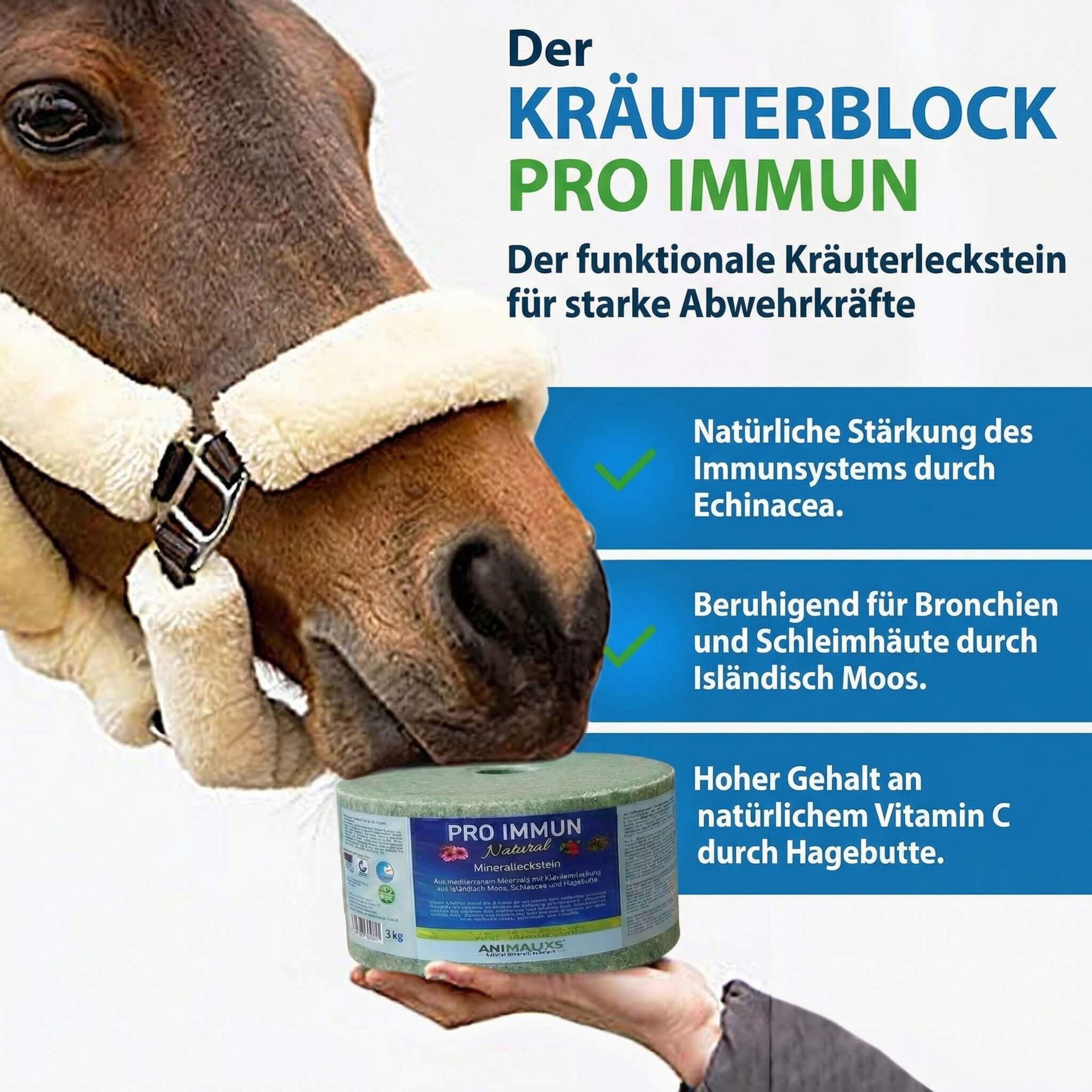 Verwöhnen und Schützen in einem: Der KräuterBlock PRO IMMUN ist weit mehr als ein gewöhnlicher Mineralleckstein. Er kombiniert wertvolle Mineralstoffe mit der geballten Kraft der Natur aus Isländisch Moos, Echinacea und Hagebutte. Diese speziell auf das Immunsystem von Pferden abgestimmte Rezeptur unterstützt gezielt die natürlichen Abwehrkräfte und fördert das Wohlbefinden der Atemwege – ideal für die nasskalte Jahreszeit oder bei hoher Staubbelastung.
